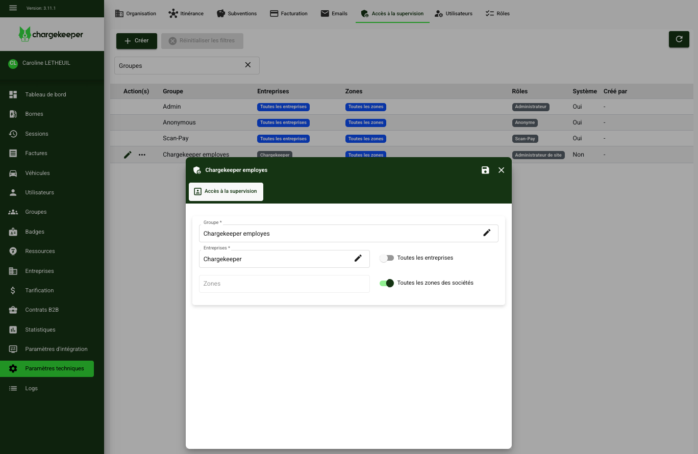 L’accès à la supervision Chargekeeper est contrôlé par les groupes et les rôles qui leur sont associés. Chaque utilisateur hérite automatiquement de ses droits en fonction des groupes auxquels il appartient.