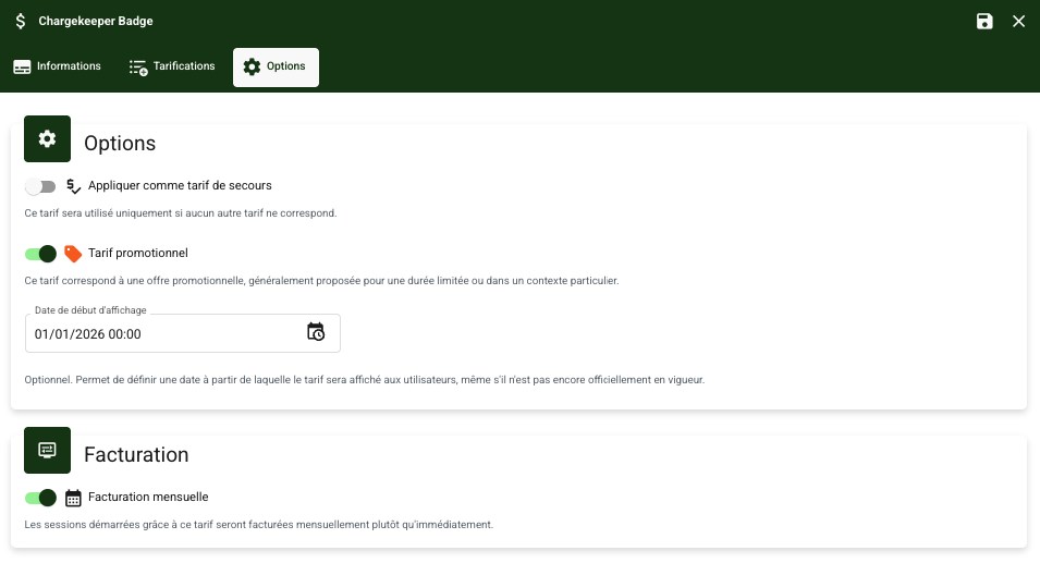 Tarif promotionnel : Vous pouvez identifier ce tarif comme promotionnel, il sera alors signalé par une icône dédiée dans l’application.Vous pouvez également activer une date de début d'affichage antérieur au démarrage du tarif pour le mettre en avant auprès des utilisateurs.