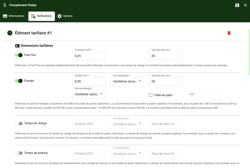 Dans Chargekeeper, aucune recharge n’est possible sans tarif, même gratuit. Le tarif est l’élément qui permet de définir qui peut recharger, où et à quelles conditions.