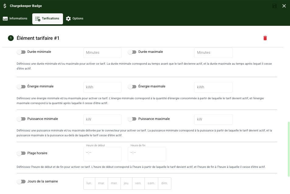 Durée minimale et maximale : Vous pouvez définir une durée minimale ou maximale de recharge pour que le tarif s'applique (par exemple, un tarif peut être appliqué uniquement si la session dure plus de 30 minutes).