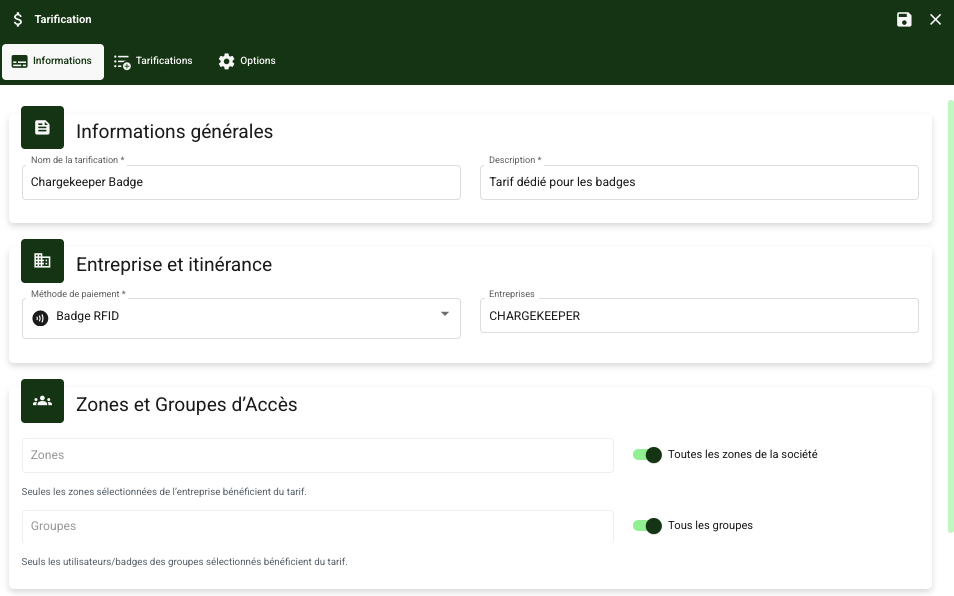 Chaque tarif possède des informations générales qui définissent son utilisation et ses paramètres de base.