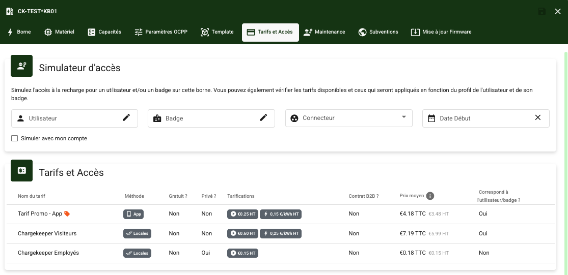 Le simulateur Tarifs & Accès est un outil clé pour contrôler et valider vos configurations dans la supervision Chargekeeper.