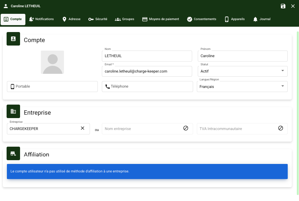 Le badge virtuel de l'utilisateur (utilisé pour des sessions de recharge via l'application mobile) est supprimé.