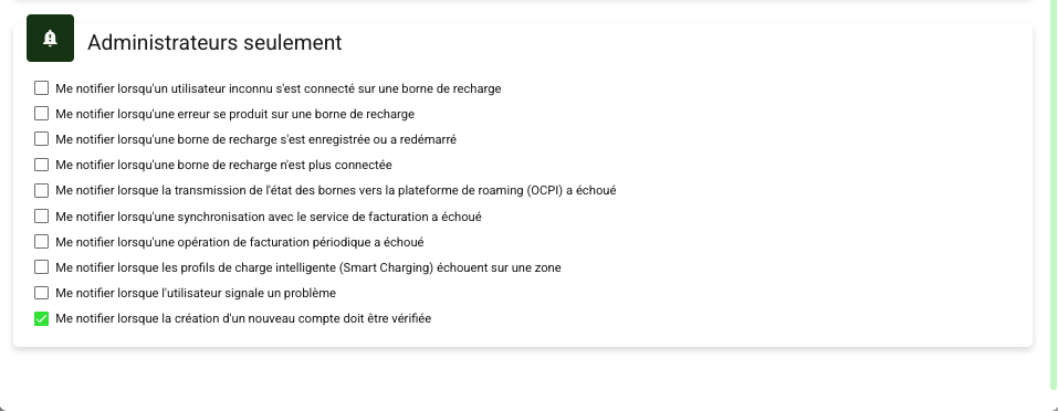 Par ailleurs, pour les comptes disposant d’un rôle Admin, des notifications spécifiques peuvent être activées. L’activation de ces notifications est possible uniquement depuis la supervision.