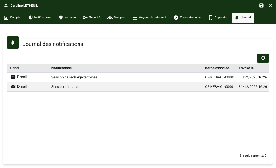 Les sessions de recharge de l'utilisateur sont anonymisées. Cela signifie que toutes les informations personnelles associées à ces sessions sont supprimées, mais les données techniques (comme la durée et la consommation) sont conservées à des fins d'analyse.