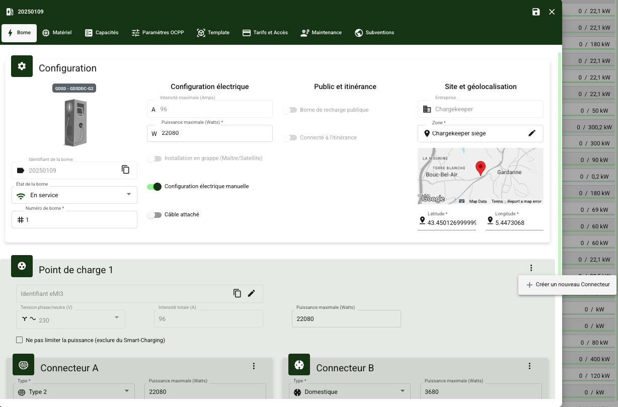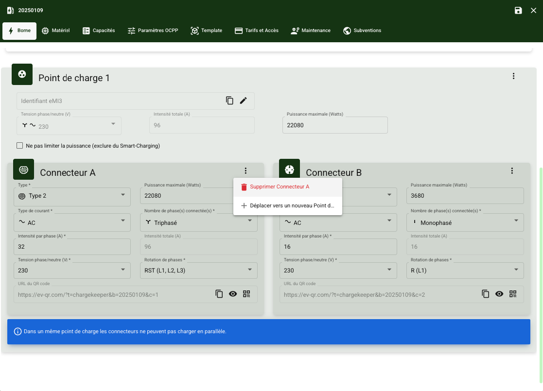 | Modifier un point de charge ou un connecteur | Vous pouvez modifier la configuration d'un connecteur (Type, courant, intensité, phases, puissance…) |