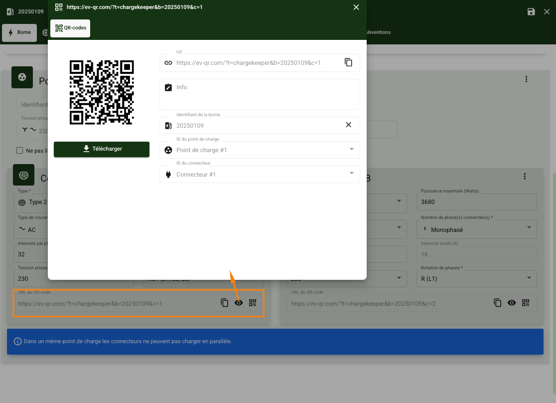 Chaque connecteur dispose d'un QR Code unique, généré automatiquement par Chargekeeper. Ce QR Code joue un rôle clé dans plusieurs fonctionnalités essentielles :
