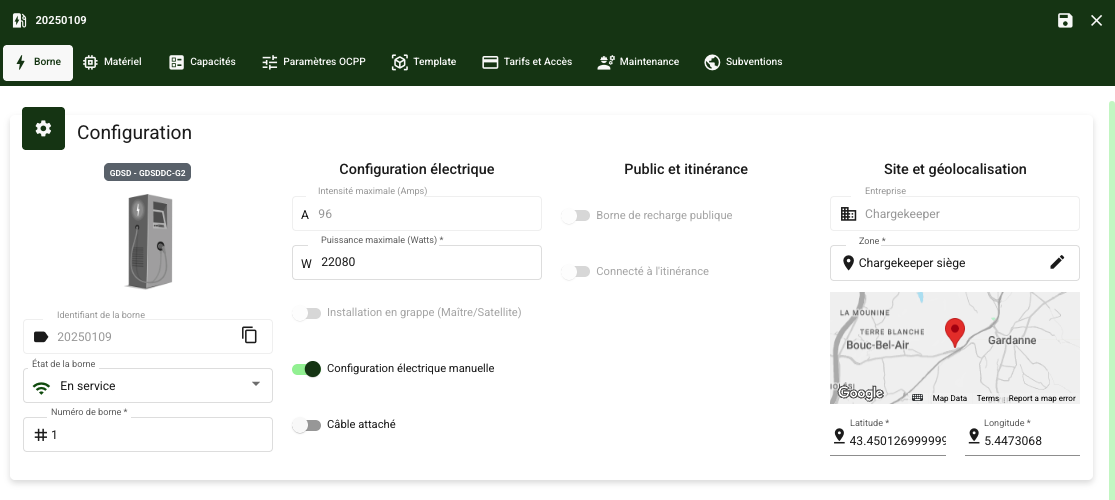 | Puissance maximale (Watts) | La puissance maximale supportée par la borne, exprimée en watts. En mode automatique, la puissance max est calculée en analysant la configuration des points de charge et des connecteurs. En configuration manuelle, il est possible d'éditer la puissance max. | ✅ |