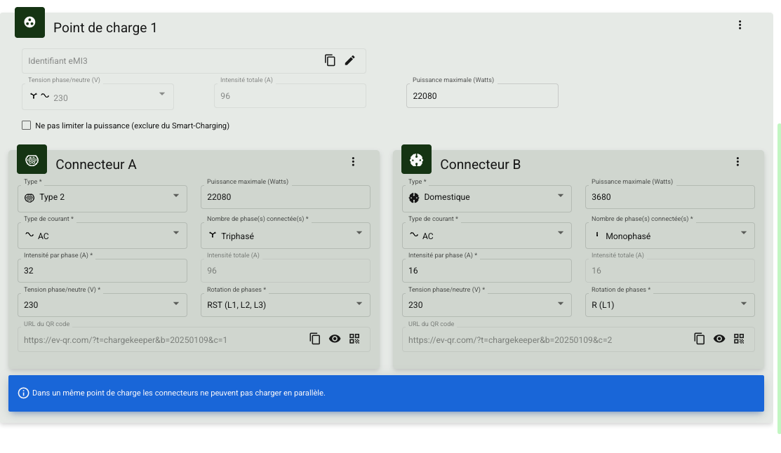 Note : Lorsque plusieurs connecteurs sont définis au sein d’un même point de charge, ils ne peuvent pas charger des véhicules en parallèle.