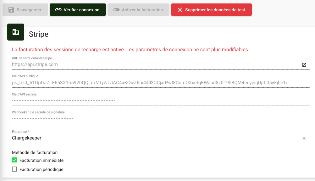 - Une fois la connexion vérifiée, vous pouvez activer la facturation des sessions de recharge.